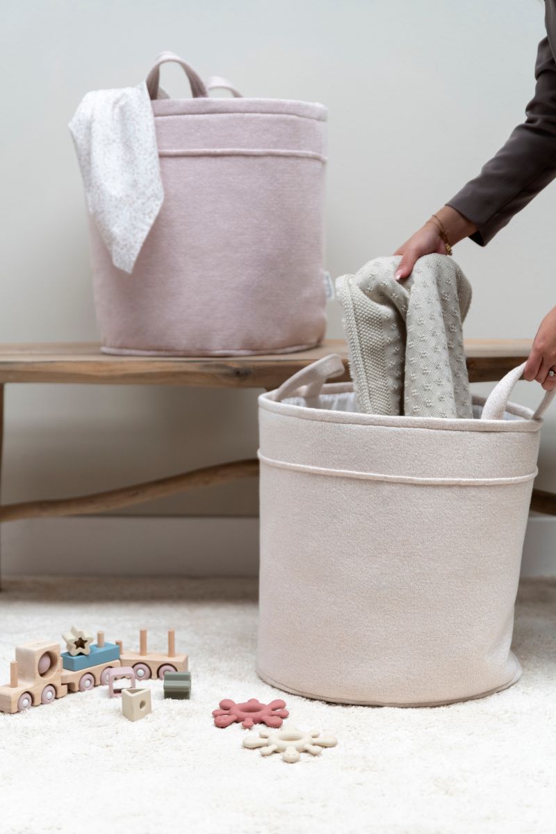 Con un diámetro de 38 cm, esta cesta de almacenaje ofrece un amplio espacio para todo tipo de objetos. El tejido de punto de alta calidad con un sutil acabado mélange en dorado y marfil confiere a la cesta un aspecto atemporal y lujoso, perfecto para cualquier cuarto infantil.