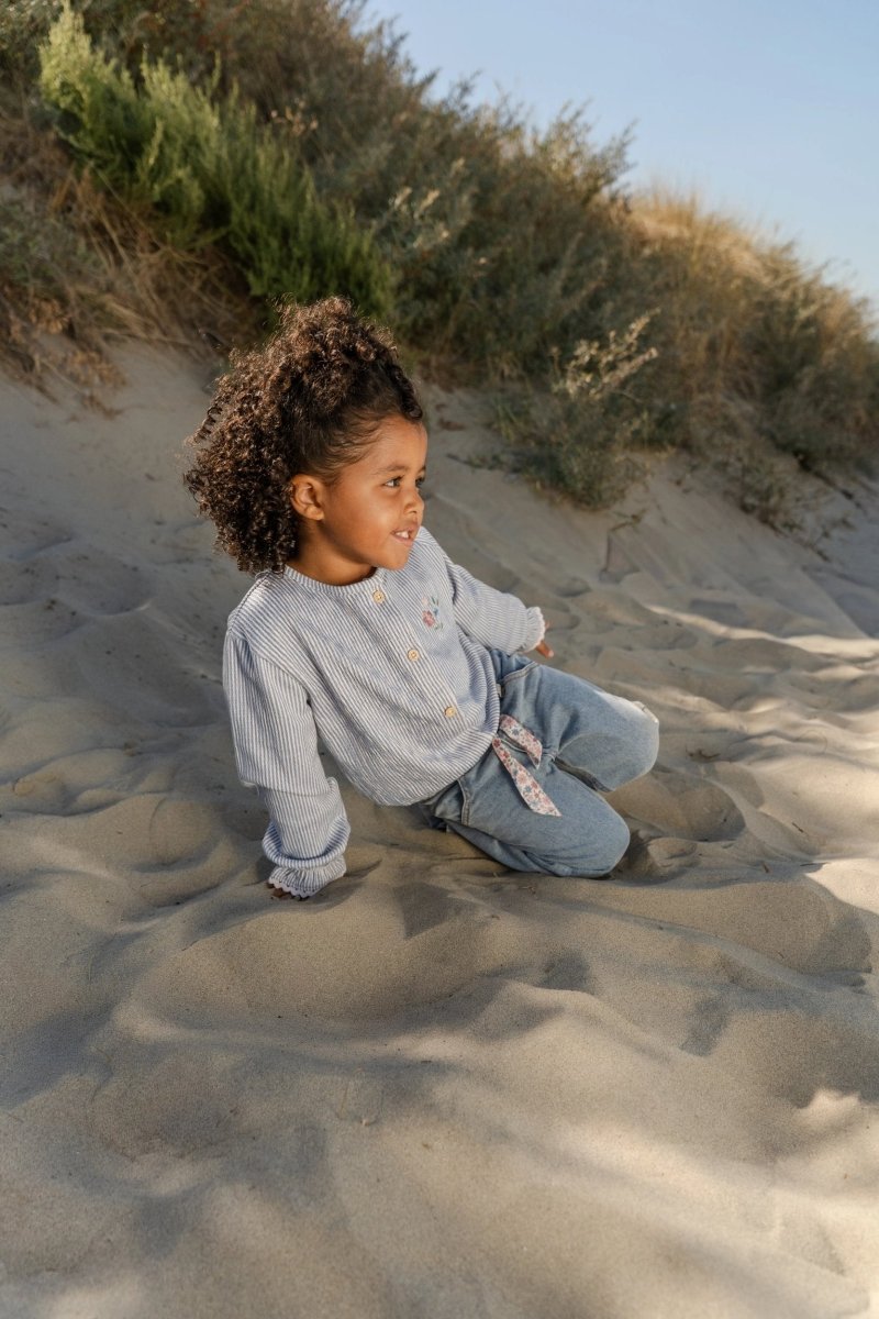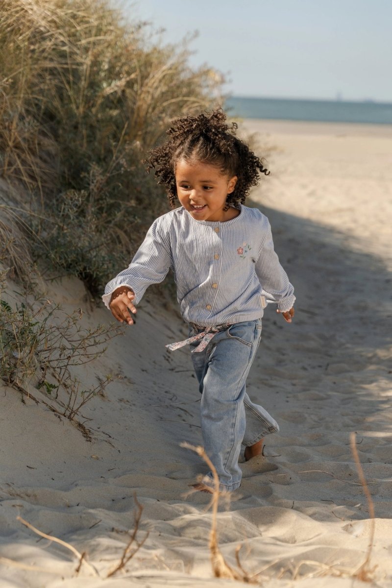 Una blusa para moverte, explorar y brillar. Esta blusa de manga larga en Raya Azul Denim está confeccionada con una cómoda calidad arrugada con un toque de elasticidad, que le permite moverse suavemente con cada movimiento. La raya estrecha confiere a la blusa un aspecto fresco y atemporal.