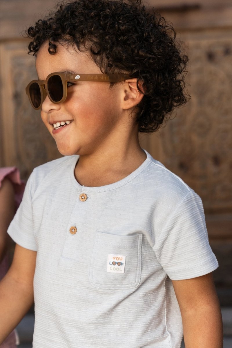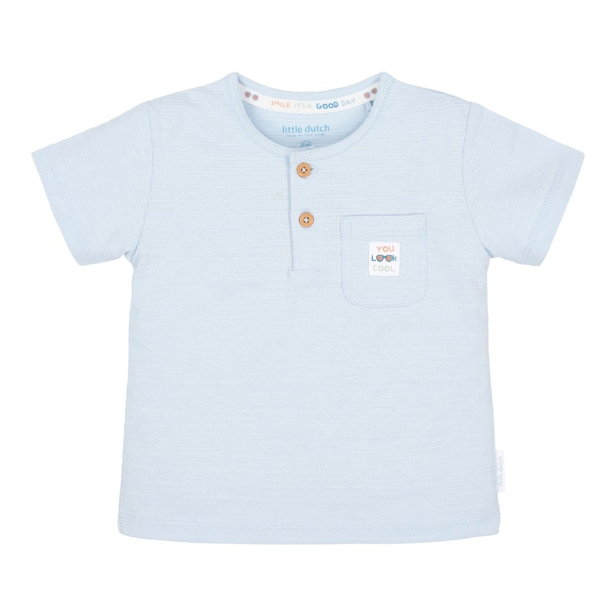 Esta camiseta azul claro es una mezcla perfecta de comodidad y estilo. Las sutiles rayas en relieve del tejido le dan un aspecto vibrante, mientras que los botones con aspecto de madera y el bolsillo del pecho con etiqueta impresa añaden un toque fresco y juguetón. Hecha de algodón 100% orgánico y con certificado Oeko-Tex, es suave con la piel pero lo bastante resistente para cualquier aventura. Ideal para los días de verano llenos de movimiento, descubrimiento y diversión.
