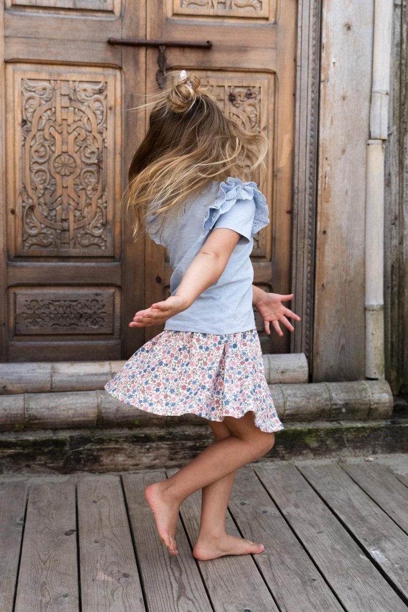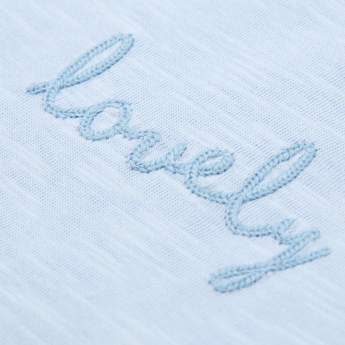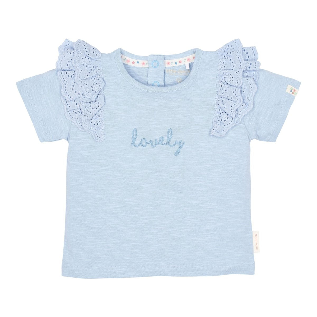 Un toque soñador, maravillosamente suave y lleno de amor. Esta camiseta azul claro es una auténtica favorita para los días de verano. Los volantes de broderie en los hombros dan a la camiseta un toque juguetón y sofisticado, mientras que la ilustración en 3D "Lovely" en el pecho desprende un mensaje cariñoso.