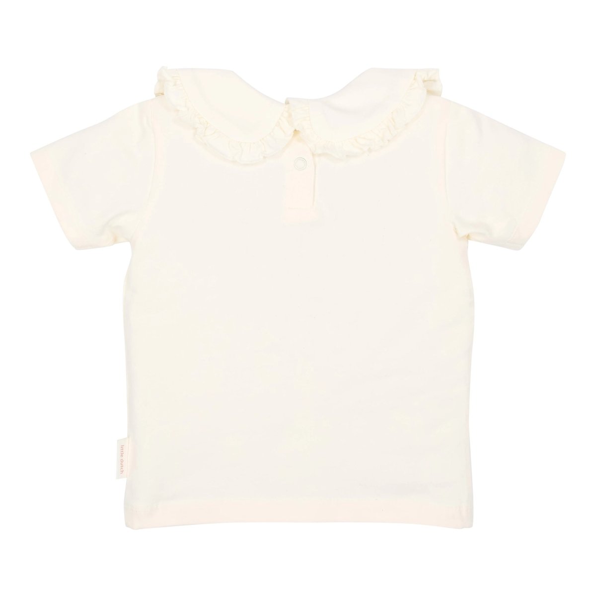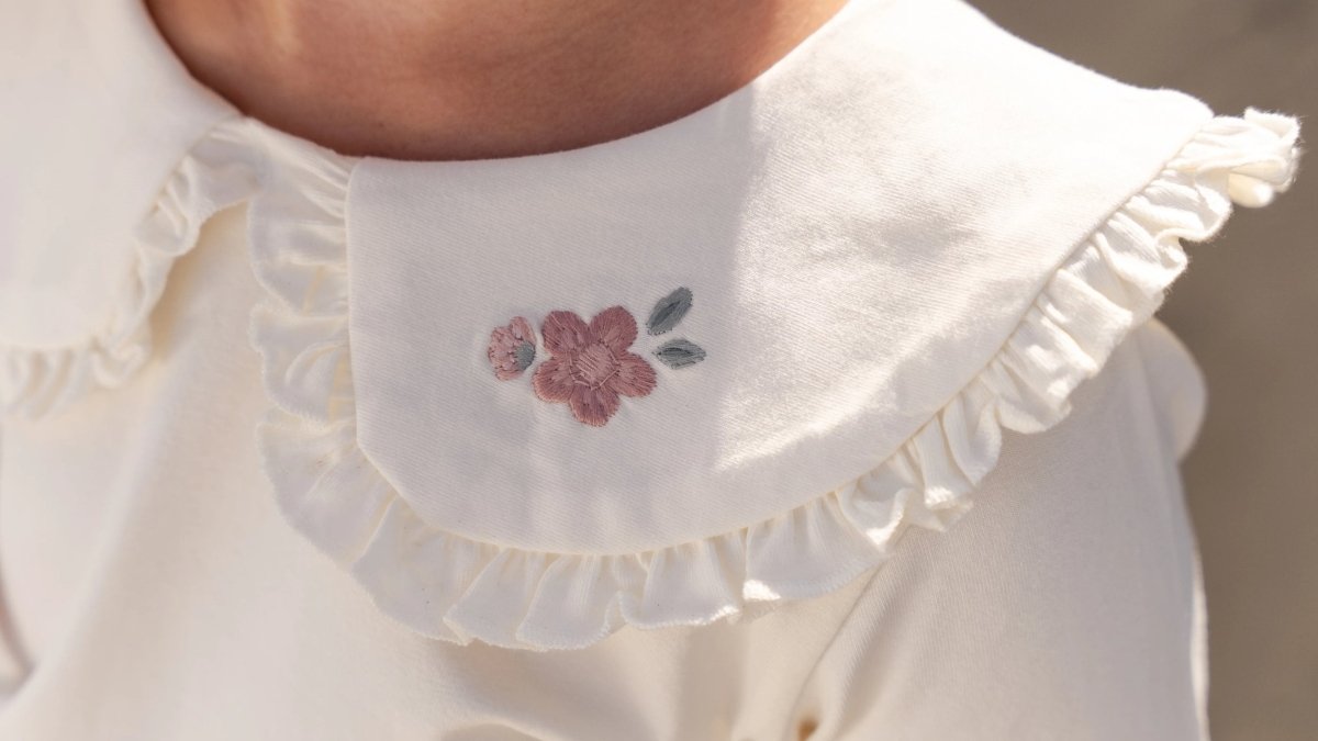 Un tacto suave y un detalle dulce. Esta camiseta de color crema es para guardar con cariño. El delicado cuello con volantes y el sutil bordado floral hacen de esta camiseta un auténtico reclamo, sofisticado y atemporal.