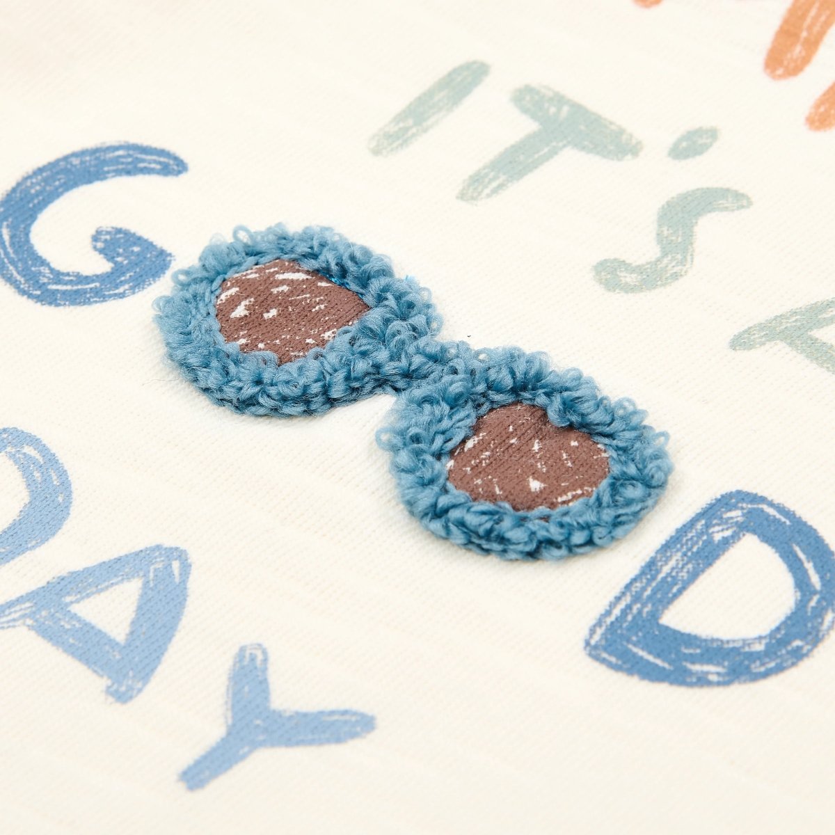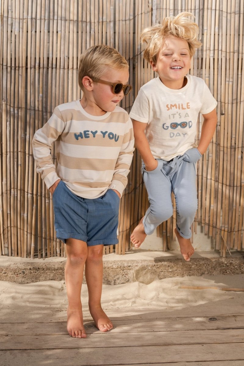 Empieza cada día con una sonrisa con esta suave camiseta en un cálido color crema. La alegre ilustración en el pecho con el texto "Sonríe, es un buen día" y un par de gafas de sol veraniegas hace que la camiseta sea aún más alegre. Las vueltas en las mangas añaden un toque fresco, mientras que el suave tejido de algodón 100% orgánico, con certificado Oeko-Tex, es maravillosamente suave y seguro para la piel sensible.