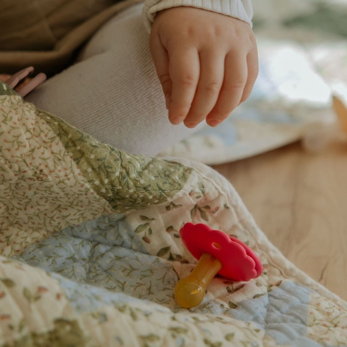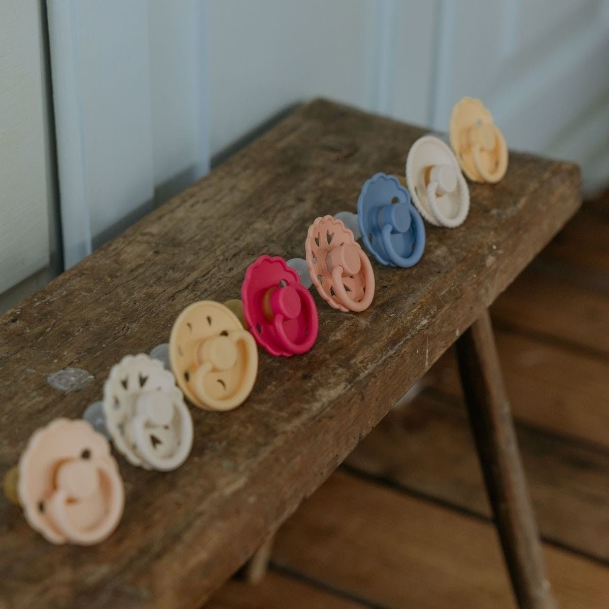 El chupete FRIGG Daisy, con bordes festoneados que imitan pétalos, es la esencia del diseño elegante. Los detalles florales y modernos llamarán la atención de cualquier madre preocupada por el estilo. Esto convierte a FRIGG en la elección perfecta para las madres de hoy que valoran los diseños clásicos con un toque moderno a la hora de elegir accesorios para el bebé.