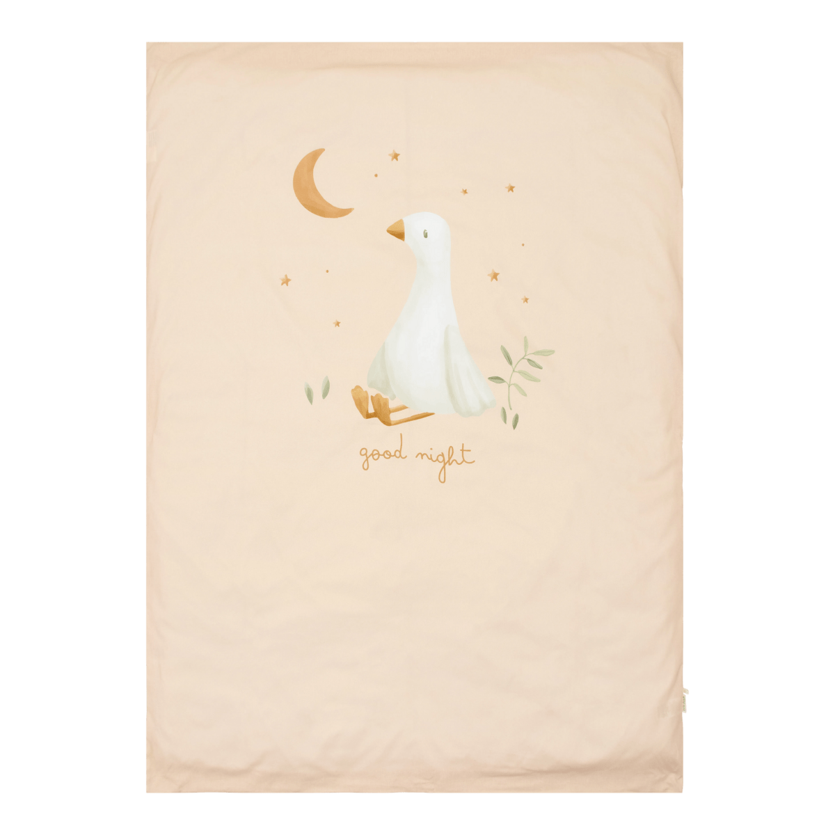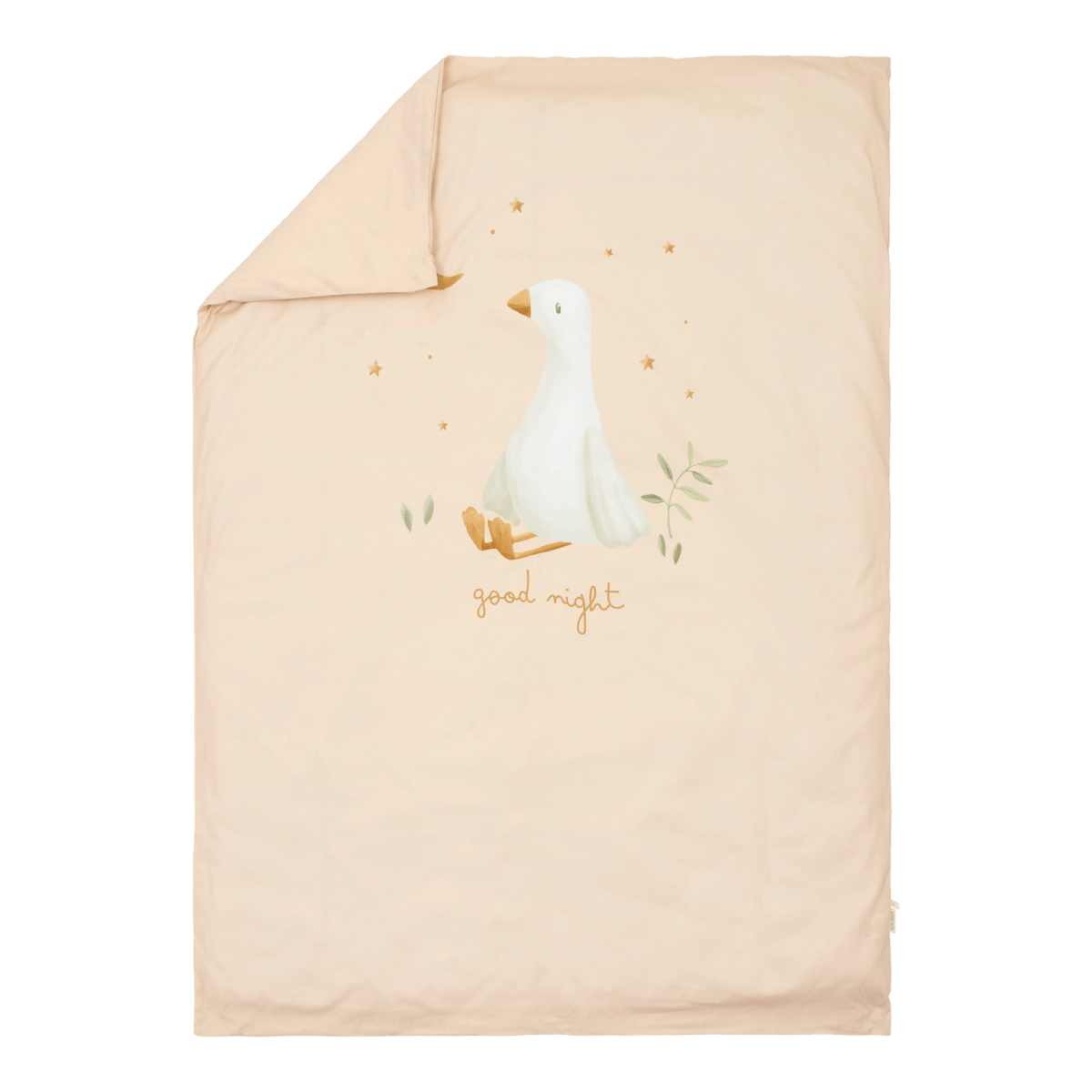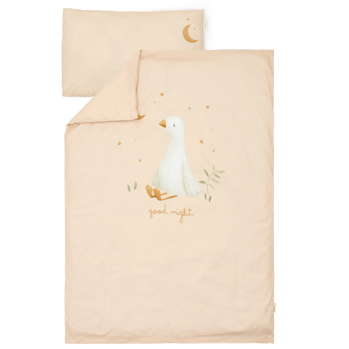 Añade un toque elegante y acogedor a la habitación del bebé con una cama bien hecha. Esta funda nórdica llevará a tu pequeño a aventuras de ensueño. Hecha de algodón 100% orgánico, es maravillosamente suave al tacto y transpirable, perfecta para una cómoda noche de sueño. El bonito color, combinado con las dulces ocas, crea un aspecto juguetón y relajante. La funda nórdica tiene un tamaño de 110 x 140 cm y una funda de almohada a juego de 40 x 60 cm. Ambas están cuidadosamente acabadas y diseñadas para proporcionar a tu pequeño un sueño maravilloso. Una elección perfecta para los pequeños amantes de los gansos