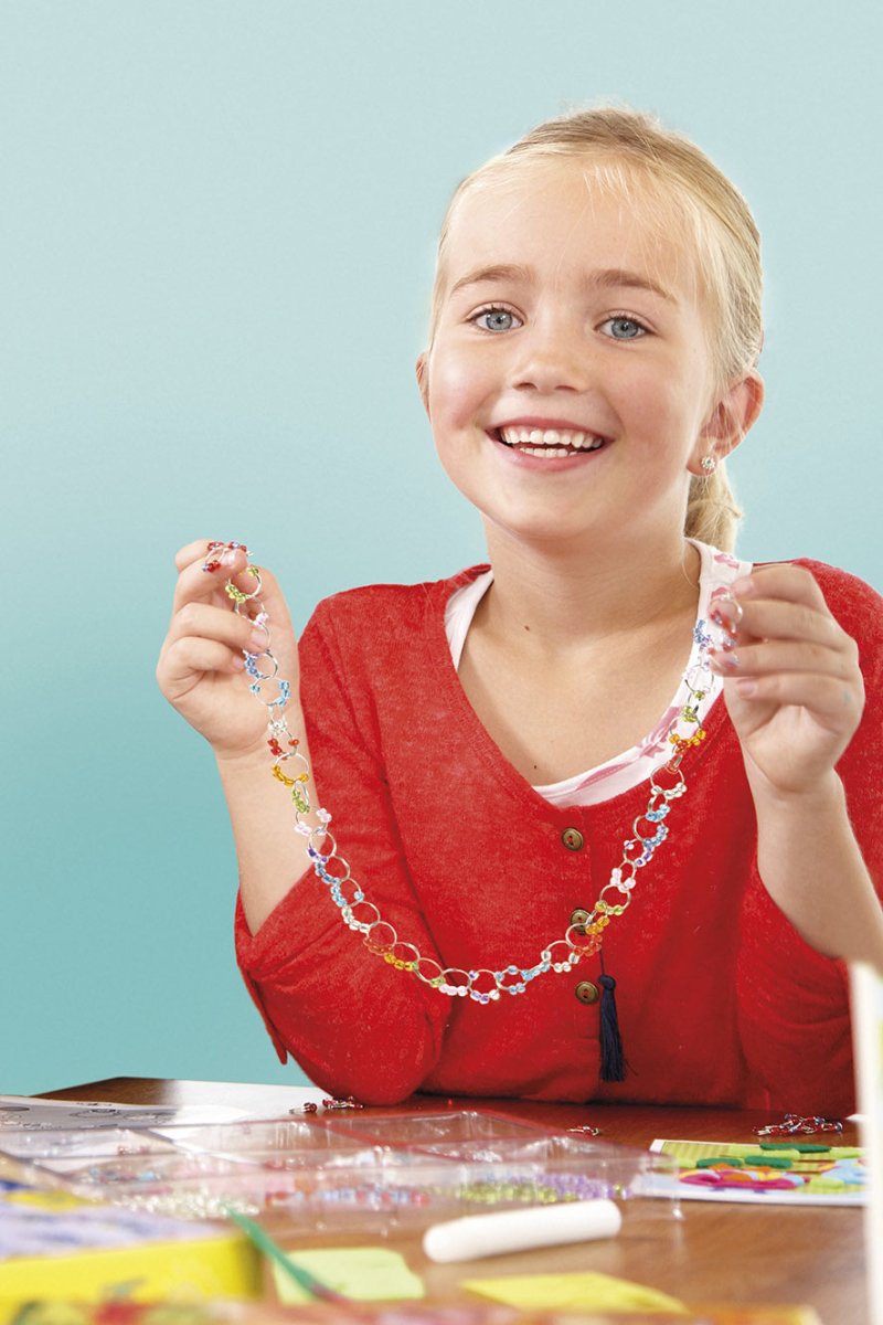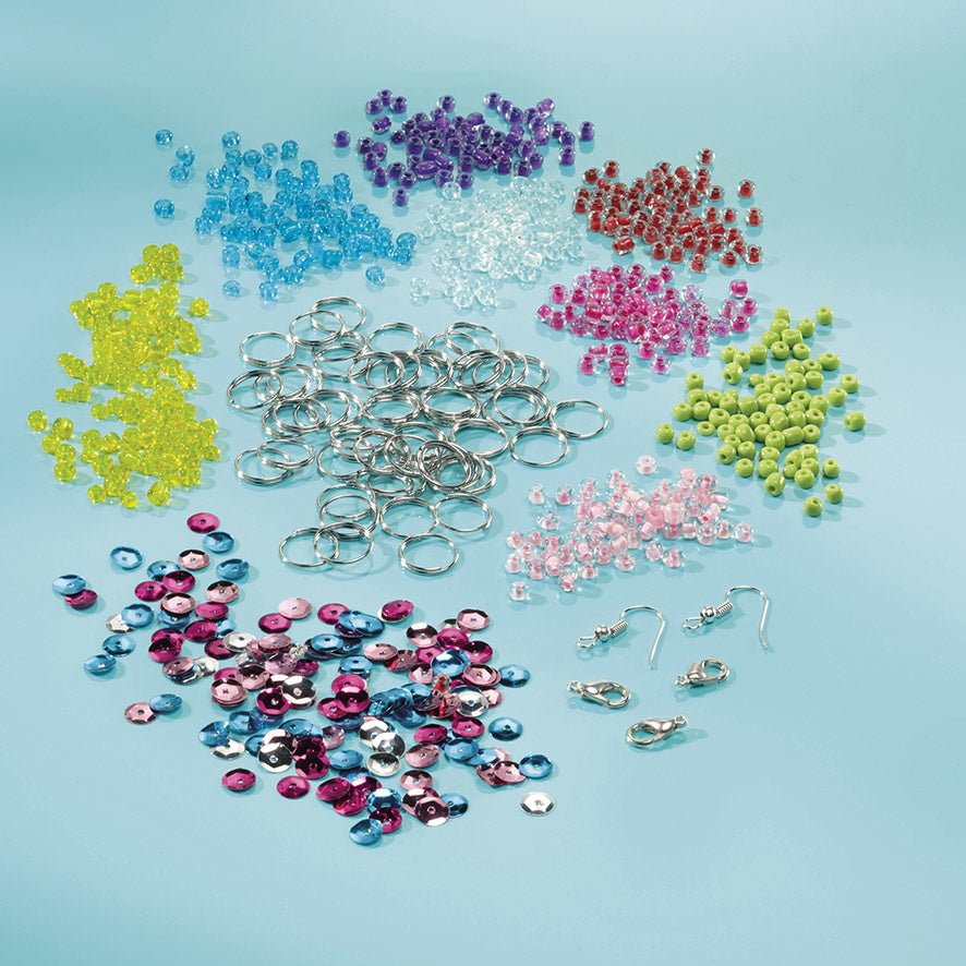 Haz preciosas pulseras, collares y pendientes con este set de bisutería con innumerables cuentas y lentejuelas. Contenido: anillas metálicas, colgantes para pendientes, cierres, lentejuelas y montones de cuentas de varios colores e instrucciones.