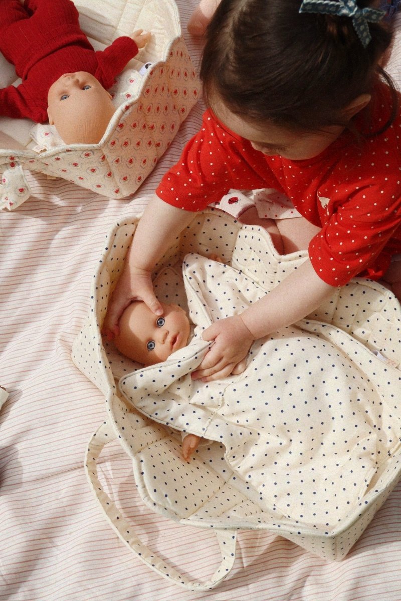 Suave ropa de cama acolchada para muñecas hecha de algodón 100%, perfecta para una cama de muñecas acogedora y cómoda. Diseñada con suaves ribetes para un acabado elegante. La ropa de cama viene en una bolsa a juego con cierre de cordón, muy práctica para guardarla o llevarla de viaje.