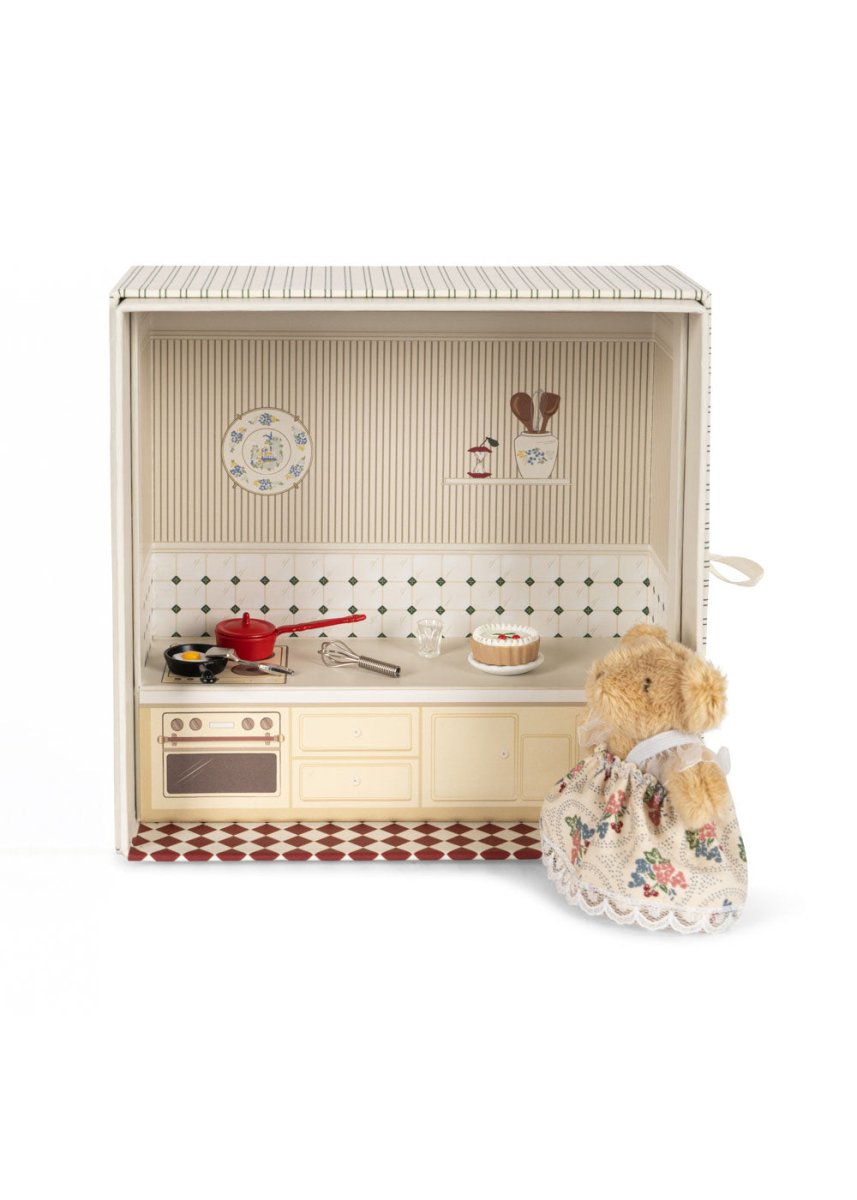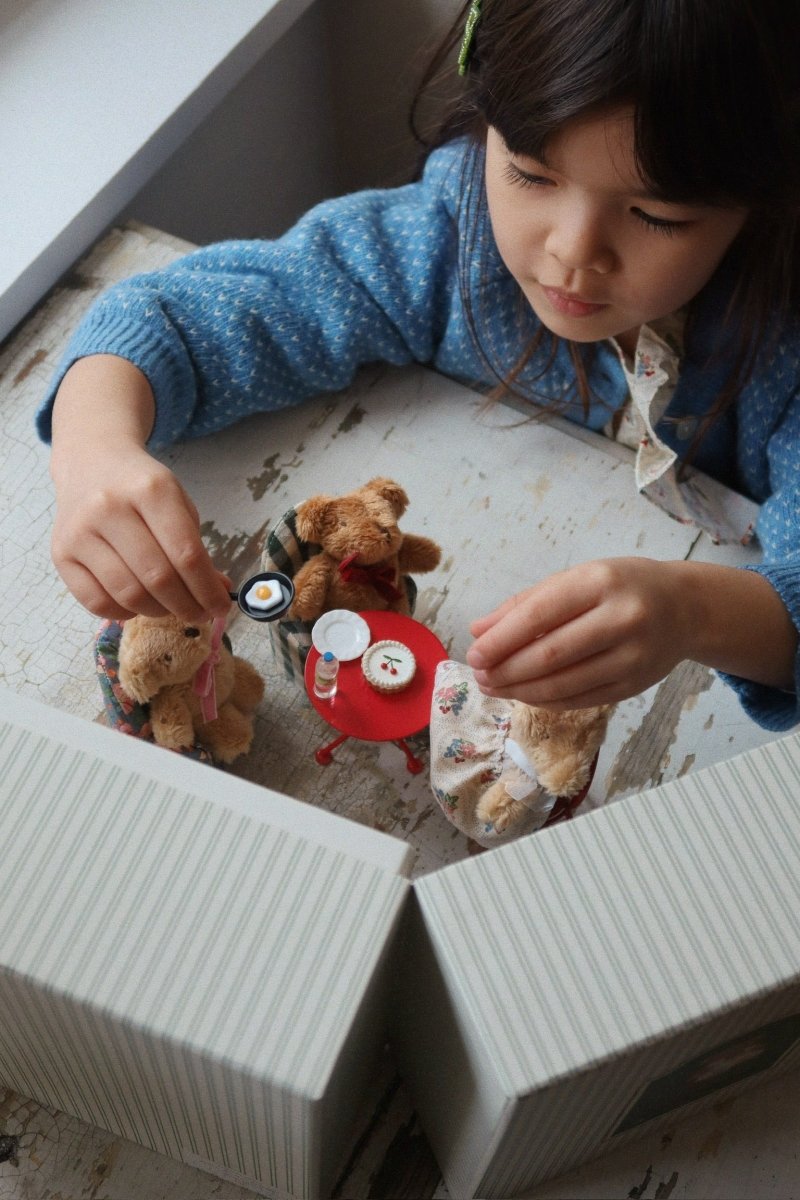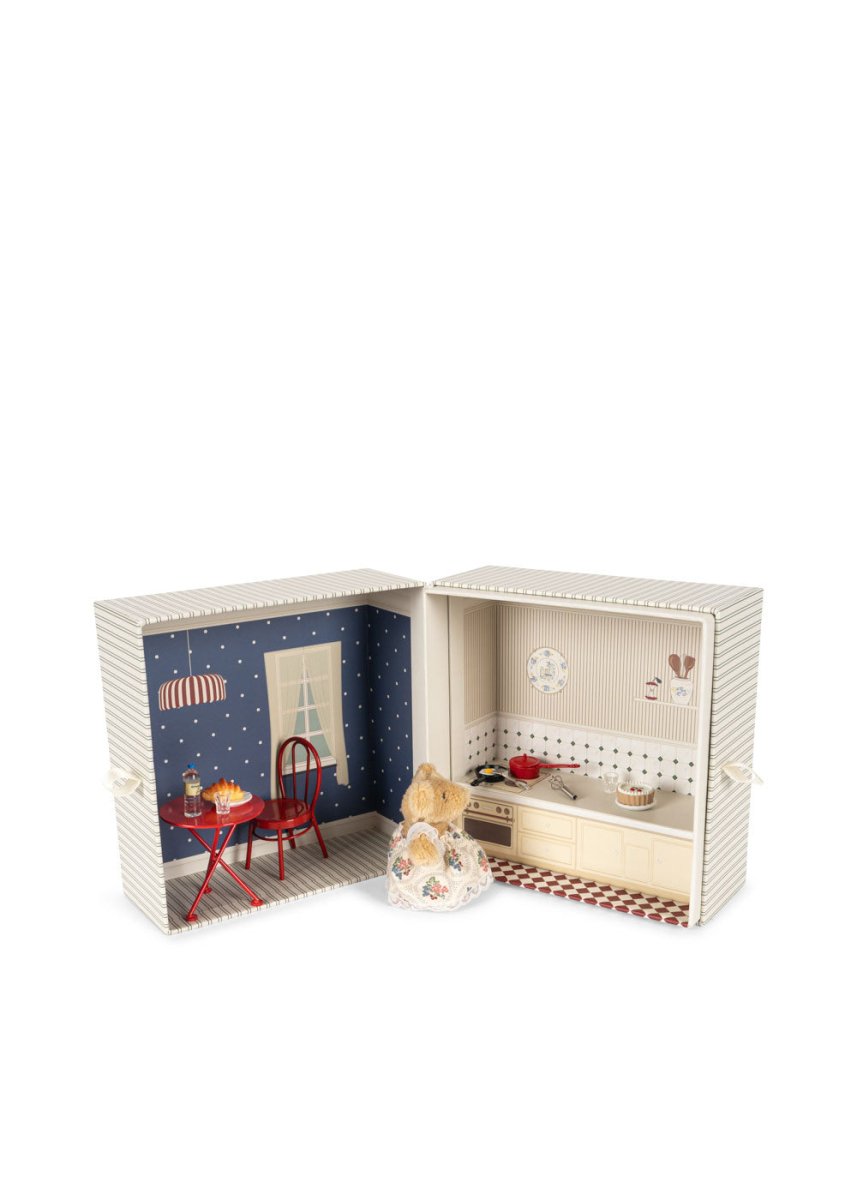 Tan pequeña y tan mona. Esta mini casita está hecha especialmente para tus ositos de peluche favoritos. Completa con una cocina y un comedor, la casita incluye una sillita, una mesa, un pastelito y bebidas preparadas en la cocina. Además, incluye un adorable mini osito con el que jugar enseguida.