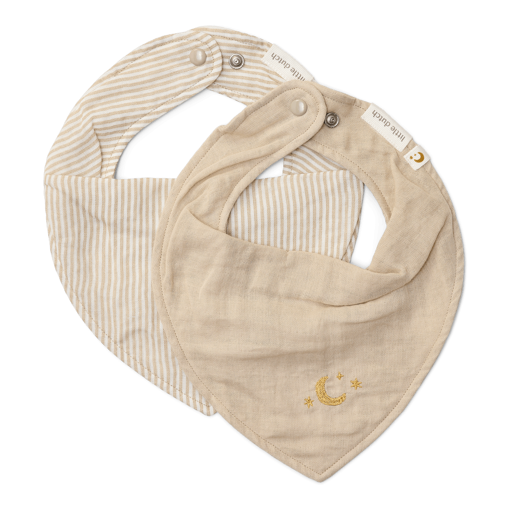 Mantén seco y elegante el conjunto de tu pequeño durante la dentición con este práctico babero bandana set de 2 - Beige Puro Suave. Fabricado con algodón 100% orgánico, el tejido hidrófilo es suave con la delicada piel del bebé y absorbe la humedad, manteniendo a tu hijo seco y cómodo.