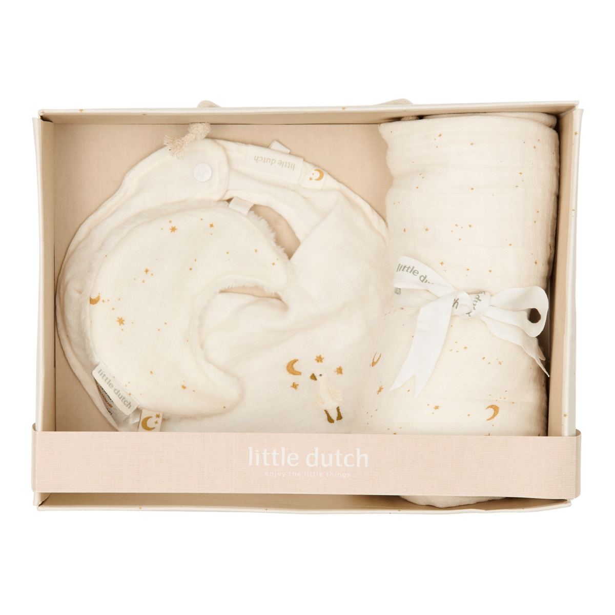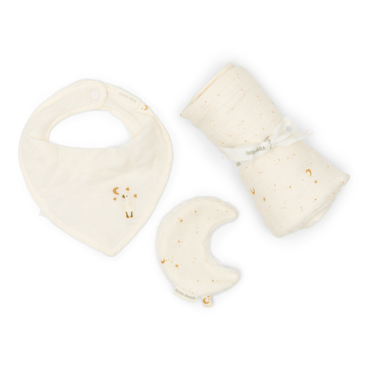 ¡Haz el regalo perfecto con esta lujosa caja de regalo! El set contiene 3 artículos imprescindibles: una toallita hidrófila y una toallita higiénica con el adorable estampado Luna &y Estrellas&, además de una bandana en un tranquilo color Blanco suave con un bonito bordado. Hechas de muselina, prelavadas y arrugadas, estas toallitas y la bandana son maravillosamente suaves y superabsorbentes. La caja a juego no sólo es perfecta para regalar, sino también ideal para guardar recuerdos de tu pequeño (porque todos sabemos que esas primeras zapatillas tienen que estar guardadas en algún sitio).