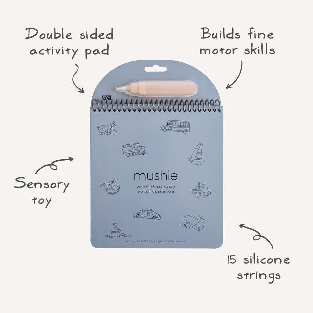 Cada juego contiene cuatro resistentes páginas que con un poco de agua se convierten en coloridas escenas llenas de sorpresas. Con el pincel recargable incluido, las manitas pueden "pintar" fácilmente, sin ensuciar. Una vez secas, los colores desaparecen y las páginas están listas para ser redescubiertas una y otra vez