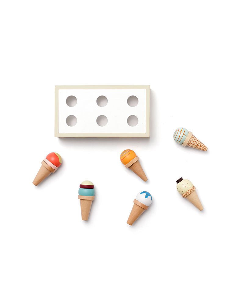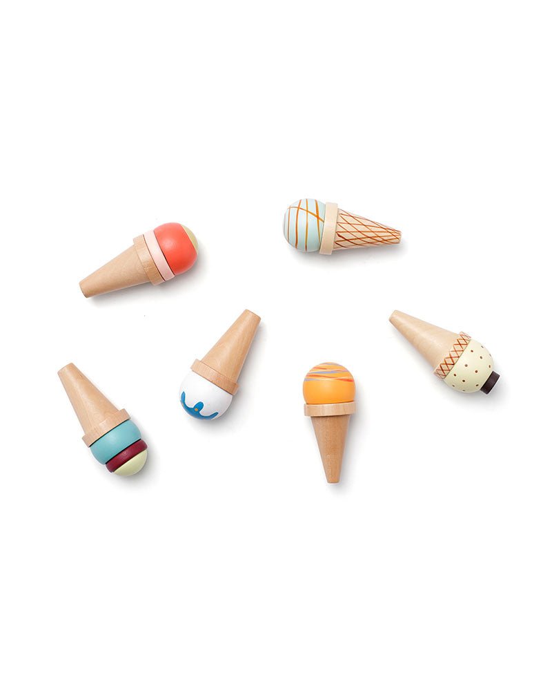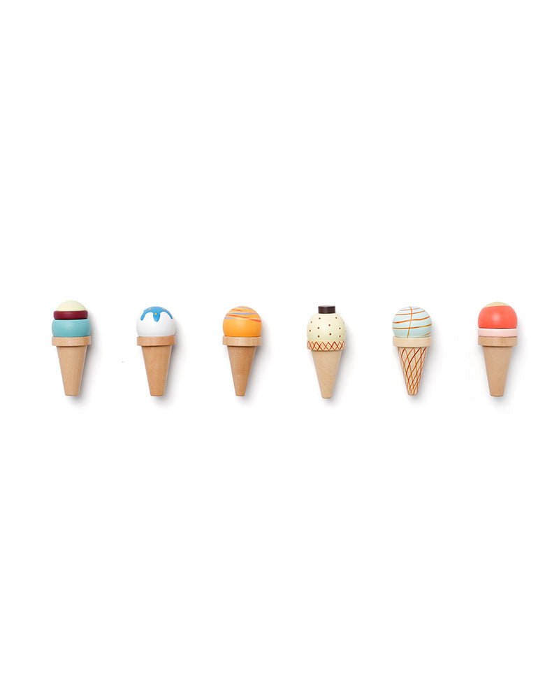 Disfruta de infinitas horas de diversión con este juego de seis conos de helado de madera, cada uno con un diseño único que invita a los niños a participar en imaginativos juegos de rol. Los cucuruchos de helado vienen en una práctica caja de madera con tapa, provista de seis aberturas para mantener todo en su sitio. Los niños pueden "vender helados" junto con amigos y familiares en su cocina de juegos o puesto de helados, fomentando las habilidades sociales y la imaginación.