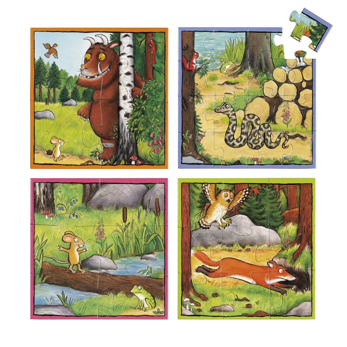 Los puzles son una de las primeras actividades con las que un niño entrena la motricidad. El juego consta de cuatro puzzles de 4, 6, 9 o 16 piezas con dibujos de tus personajes favoritos del libro: "El Gruffalo". Esto lo hace muy reconocible y muy divertido para los niños.