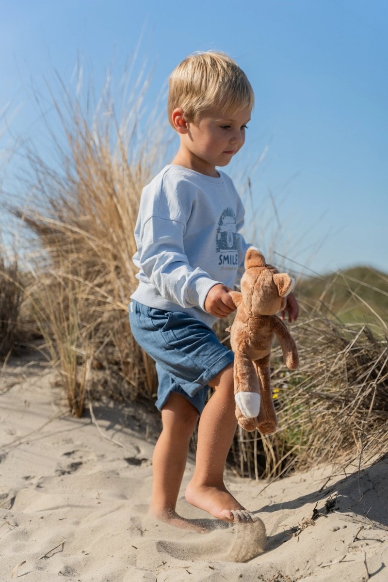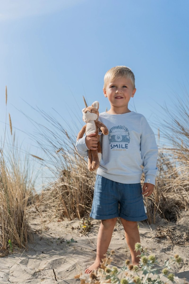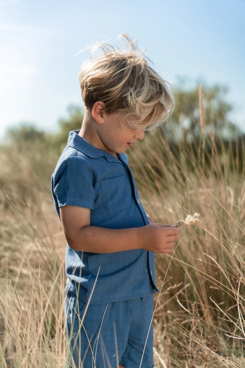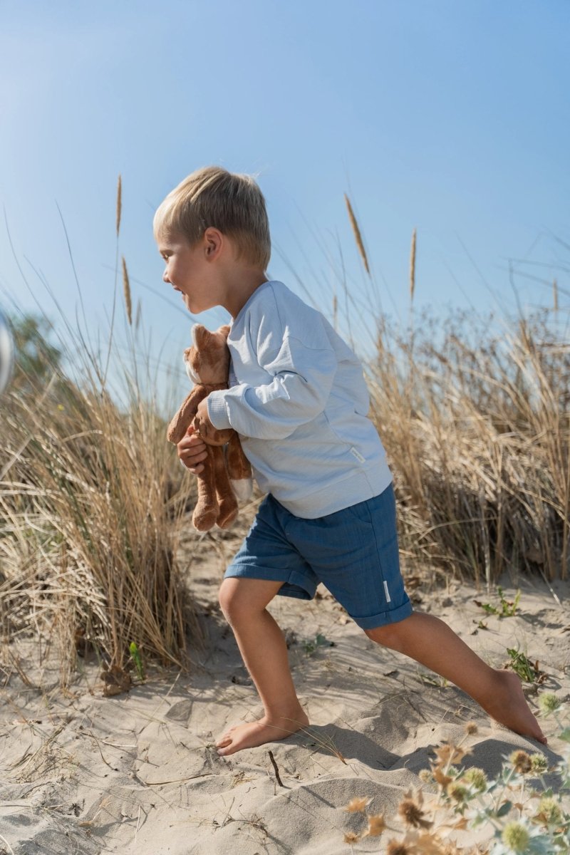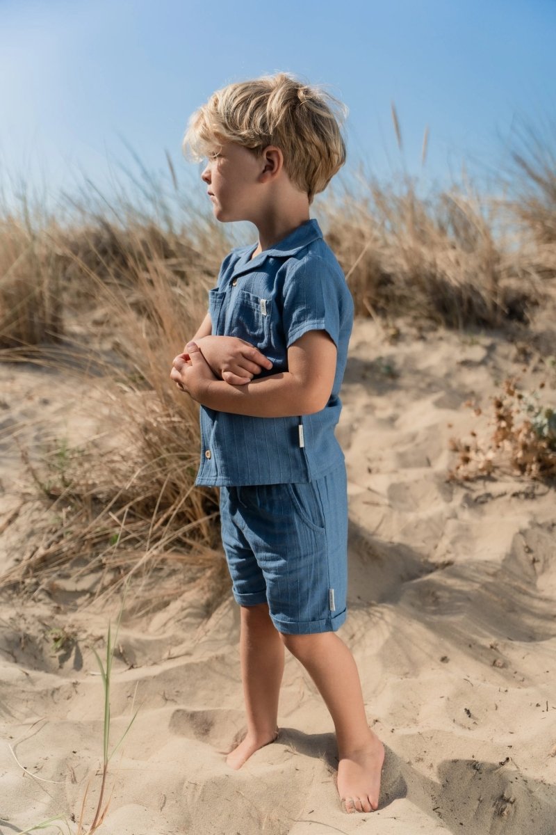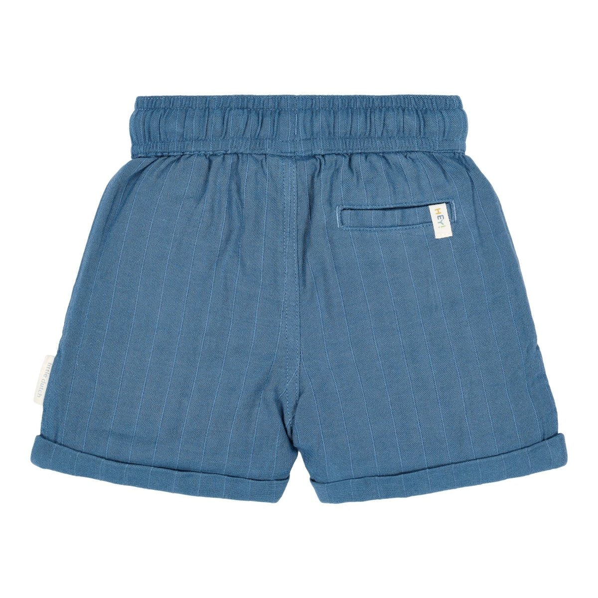 Lustrosos, frescos y perfectos para los días soleados: estos pantalones cortos en color índigo están confeccionados en un cómodo tejido de aspecto lino con sutiles detalles de rayas. La cintura elástica con cordón garantiza un ajuste ceñido, mientras que las vueltas en las perneras y los bolsillos laterales añaden un toque divertido. Confeccionados con un 55% de viscosa y un 45% de algodón orgánico, con certificado Oeko-Tex, los pantalones son suaves y transpirables.