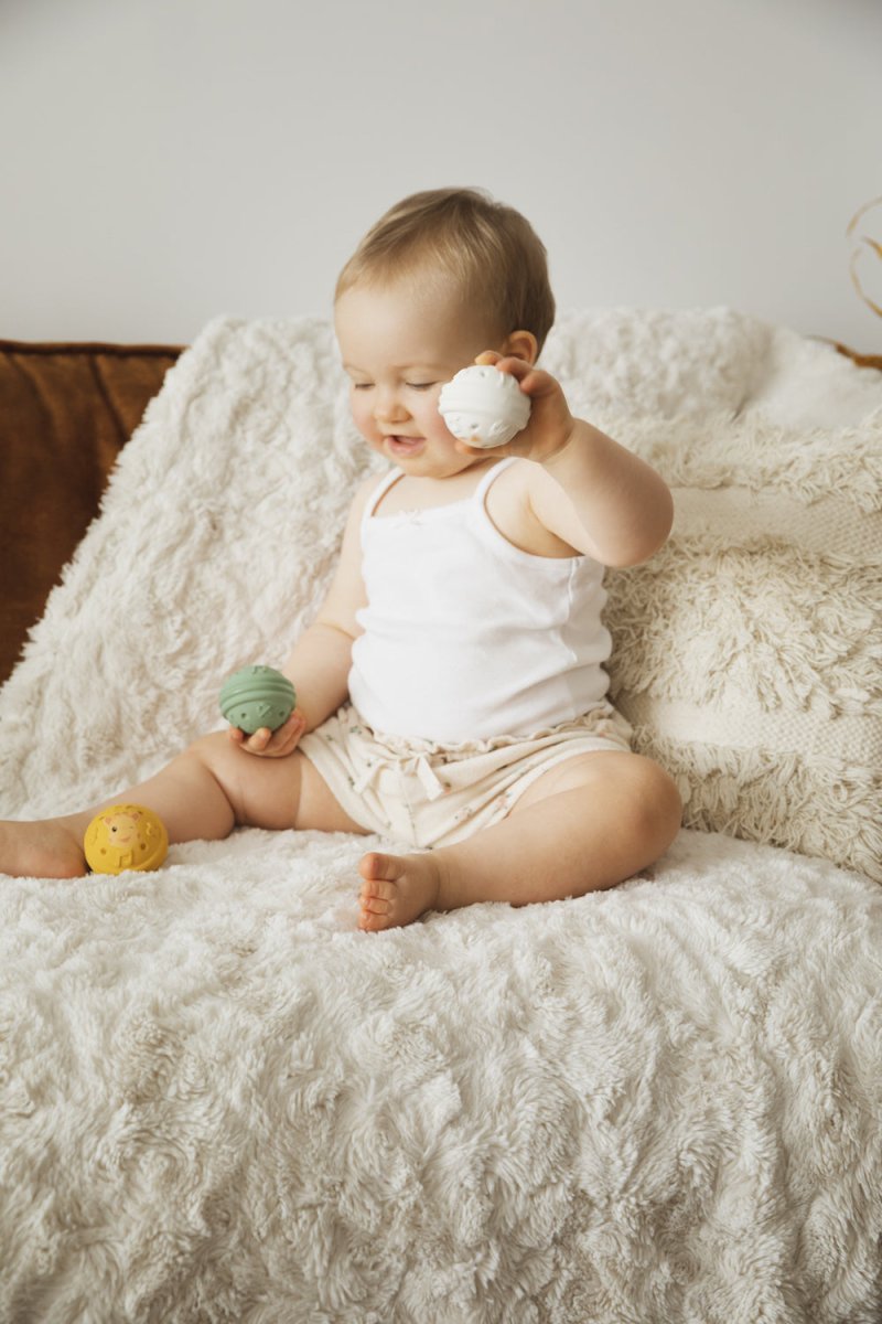 ¡Un juego de 3 divertidas pelotas musicales con diferentes sonidos para estimular el oído del bebé! Hechas de caucho 100% natural, estas 3 pelotas son ligeras y fáciles de agarrar. Cada bola tiene un sonido diferente: aprieta la bola verde y escucha el suave sonido del papel arrugado; agita la bola blanca y oye sonar la campanita; aprieta la bola amarilla y escucha un chirrido. Apto a partir de 3 meses Este producto contiene la certificación ''OK biobased'' del laboratorio independiente TUV Austria, que certifica el uso de materias primas renovables (biobased). Estas bolas musicales de juguete forman parte de la colección 5-Sentidos. Esta colección consta de 5 productos expertos: 1 producto por sentido, para guiar al bebé en las primeras etapas del descubrimiento de los sentidos. Desarrollado en colaboración con especialistas en primera infancia. Esta colección de juguetes está adaptada a las primeras etapas del desarrollo sensorial, intuitivo y evolutivo del niño, desde el nacimiento hasta los 24 meses.