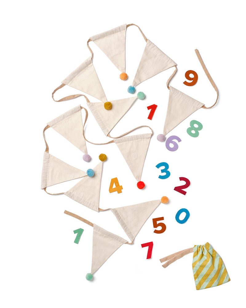 Breng kleur en vrolijkheid in elke verjaardag met deze tijdloze stoffen verjaardagslinger. De slinger is gemaakt van zachte, biologisch gecertificeerde katoen en bestaat uit kleurrijke vlaggetjes met vrolijke pompons aan de uiteinden. Eén vlaggetje heeft een klittenbandvlak waar je de meegeleverde cijfers (0–10) kunt bevestigen — zo kun je de slinger elk jaar opnieuw gebruiken, voor elke leeftijd.