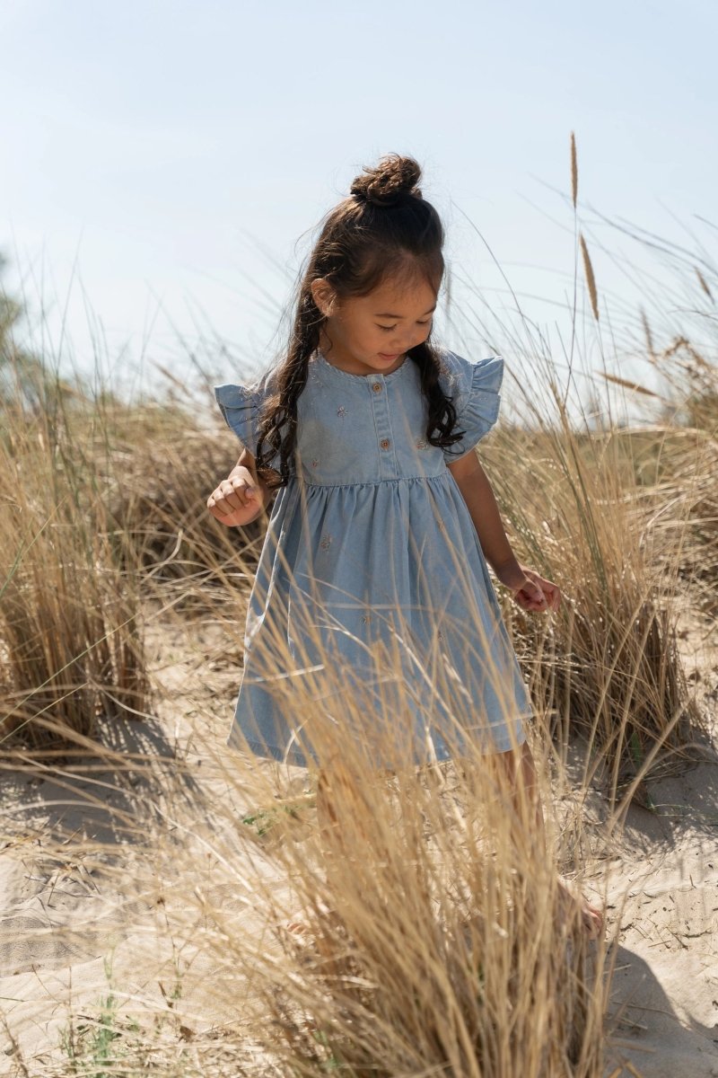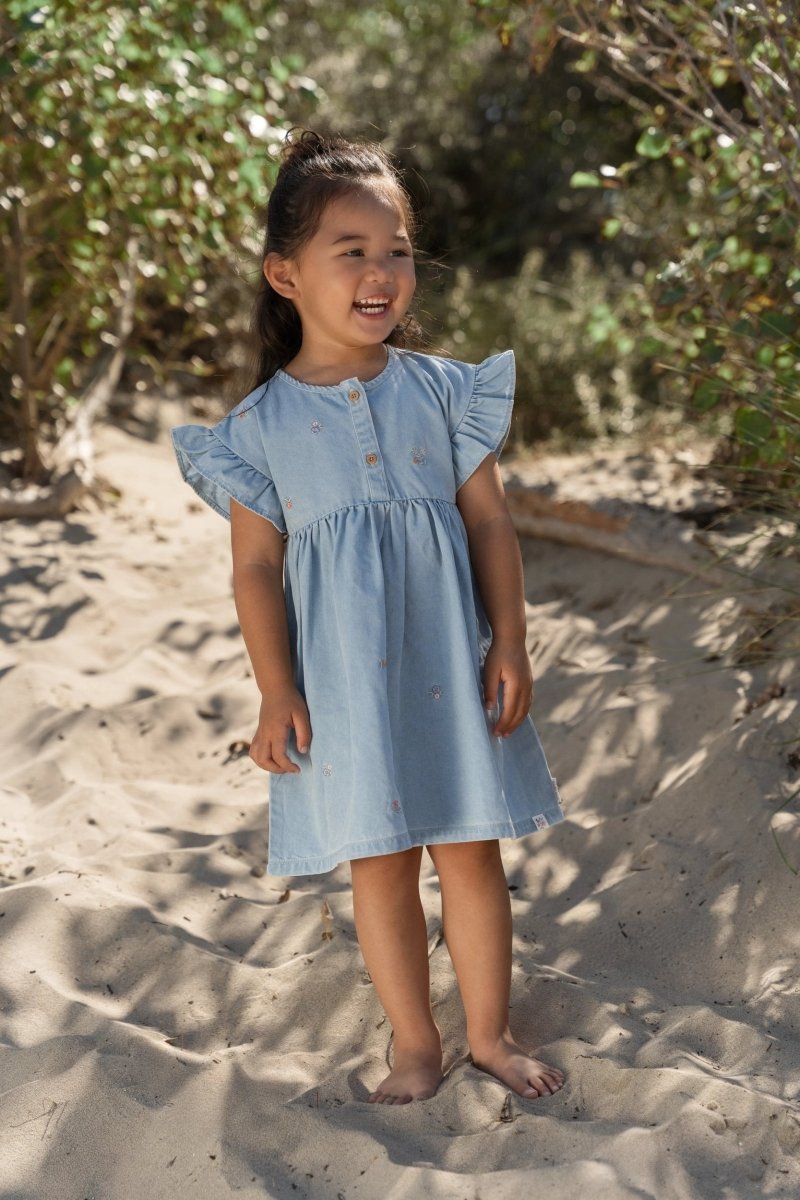 Un vestido vaquero con un toque suave. Este vestido de manga corta está confeccionado en un tejido vaquero ligero y decorado con delicadas flores bordadas, un sutil detalle que lo hace un poco especial