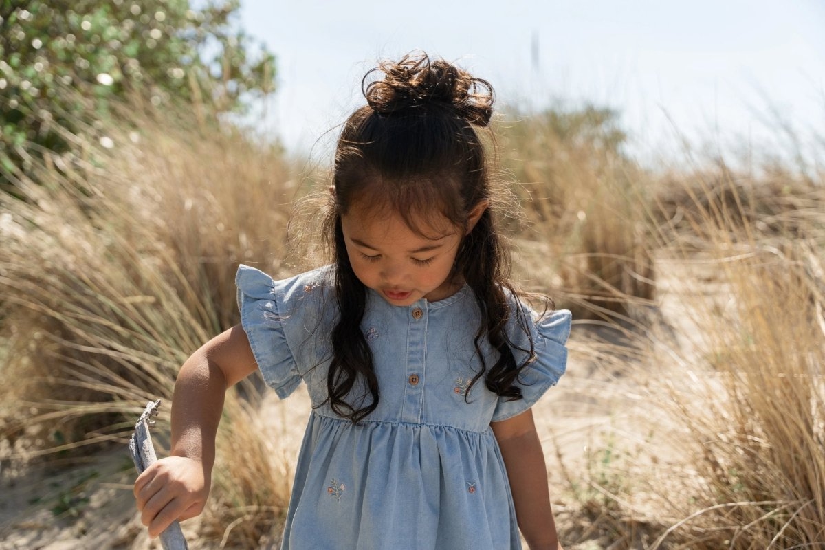 Los volantes a lo largo de las aberturas de las mangas añaden un toque juguetón, mientras que los botones con aspecto de madera facilitan el vestirse y desvestirse. Fabricado con algodón orgánico y certificado Oeko-Tex: para una elección segura y responsable, todos los días. Un vestido fino para interminables días de verano, desde un paseo matutino hasta una tarde jugando en la hierba.