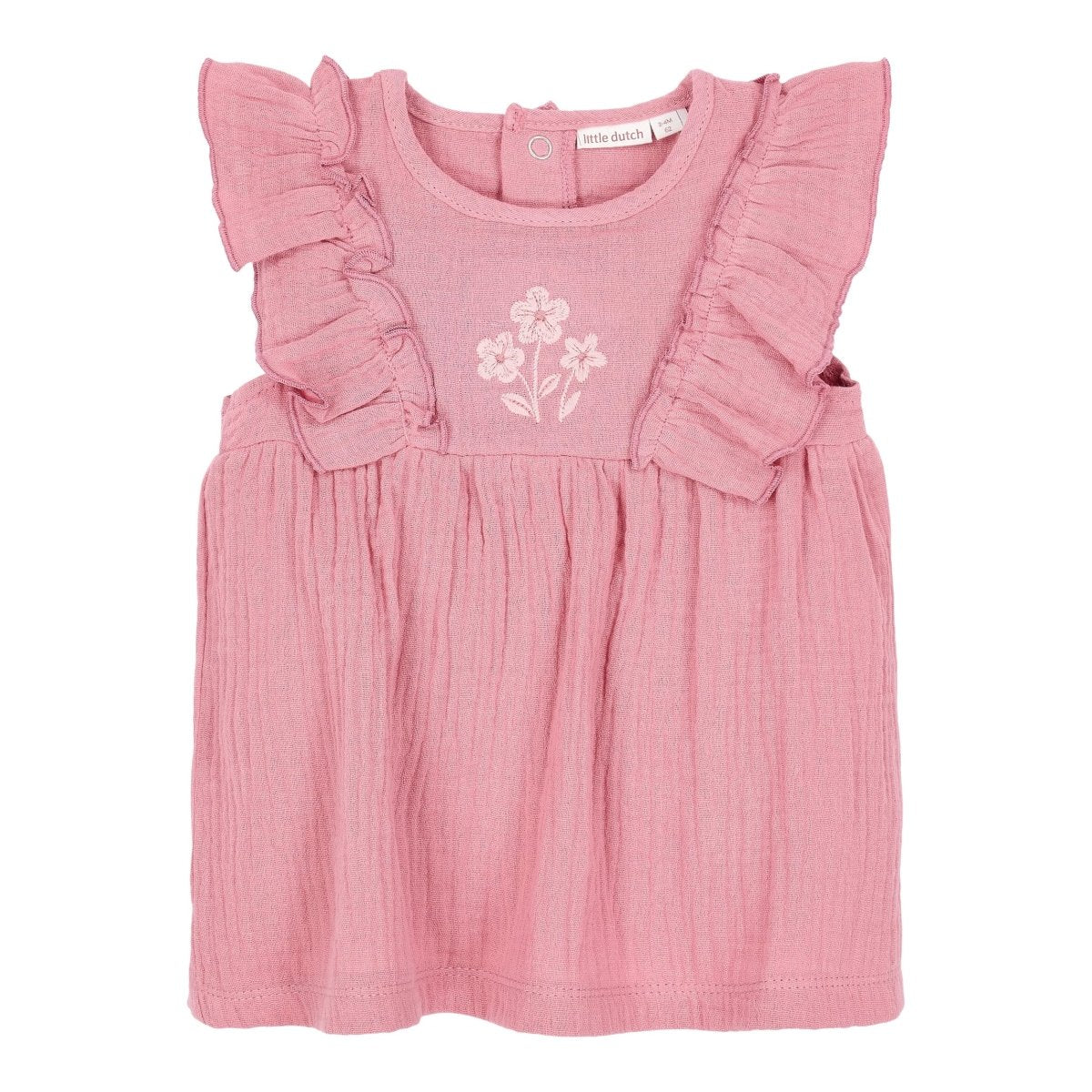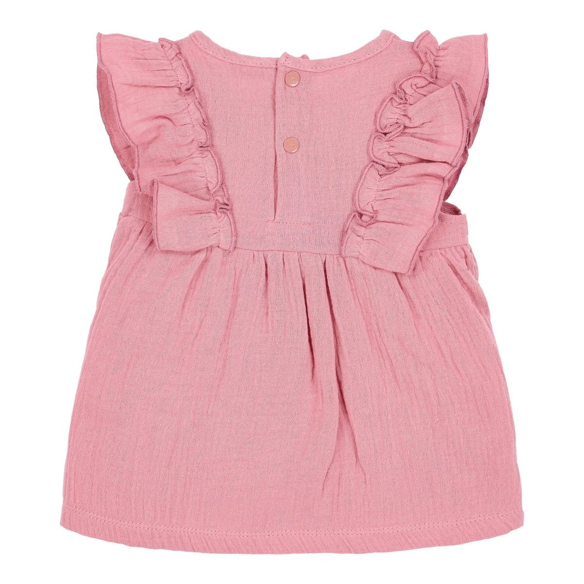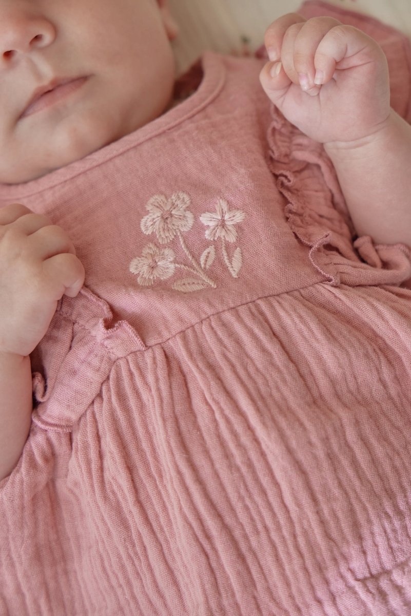 Suave, delicado y totalmente veraniego. Confeccionado en un vaporoso tejido de muselina, este vestido Rosa Blush baila a cada paso. Los volantes a lo largo de los hombros le dan un toque divertido, mientras que el diseño floral bordado en el pecho le da un toque dulce y sofisticado. El vestido viene con un pantalón a juego con cintura elástica y un bonito lazo: cómodo pero elegante, justo lo que tu pequeña necesita.